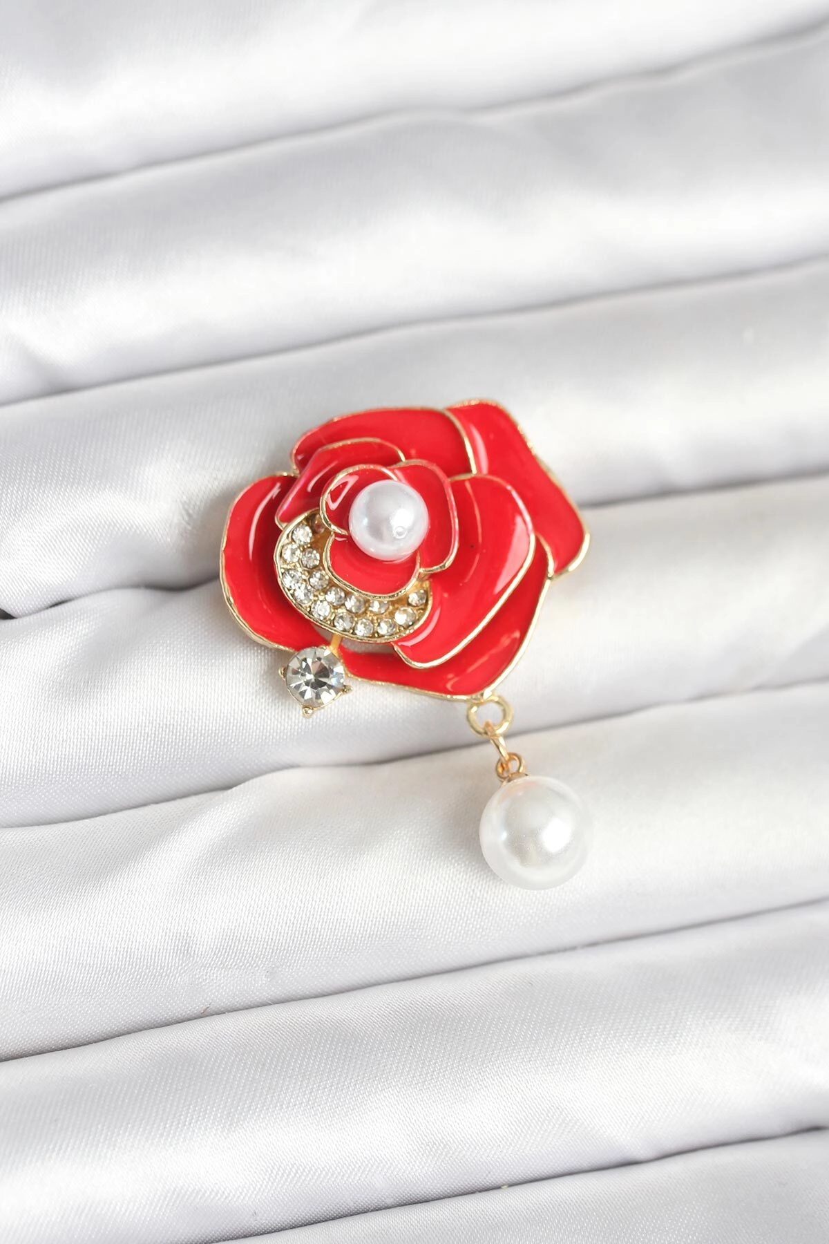 Kırmızı Gül İncili Model Broş